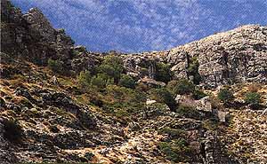 En este punto es recomendable realizar un descanso, para contemplar enfrente de la senda y a la izquierda de la misma las formaciones geológicas de las Chorreras del Perro y del Águila que en época invernal y por la nieve que se acumula en la línea de cumbres cercanas, dejan caer abundante agua por sus paredes verticales de mármol, desprendiendo reflejos y brillos sorprendentes; enfrente de la senda, y siguiendo la divisoria nos encontramos con el Salto del caballo y los Tajos de la Herradura y a la derecha se eleva el Pico del Sol, mole caliza visible desde toda nuestra ruta con una altura de 2.000 m.; la vegetación en la divisoria cambia, pudiendo observarse sabinas redondeadas ancladas en la roca y pies arbóreos aislados de arce, además de abundante matorral almohadillado como piornos y enebros rastreros.